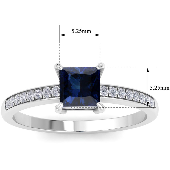This gemstone ring features one 5.25mm princess shape created sapphire gemstone weighing approximately 1 carat. There are 16 sparkling round diamonds in I-J color, I1-I2 clarity totaling approximately 1/4 carat. Total carat weight is 1 carat. This ring is in 14 karat white gold.