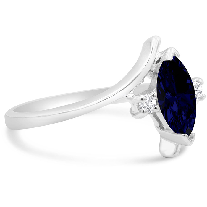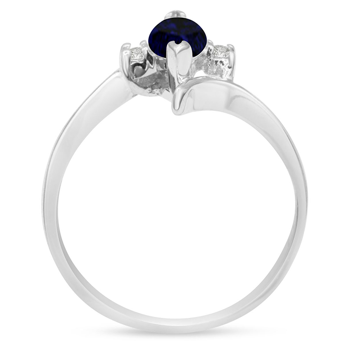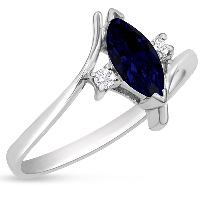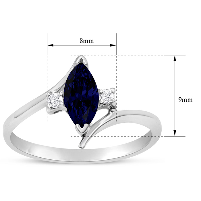 This sapphire ring features one 8x4mm marquise shape created sapphire gemstone. It is surrounded by 2 sparkling diamonds totaling 0.05 carats in I-J color, I1-I2 clarity. Total carat weight is approximately 1/2 carat. This ring is in sterling silver.