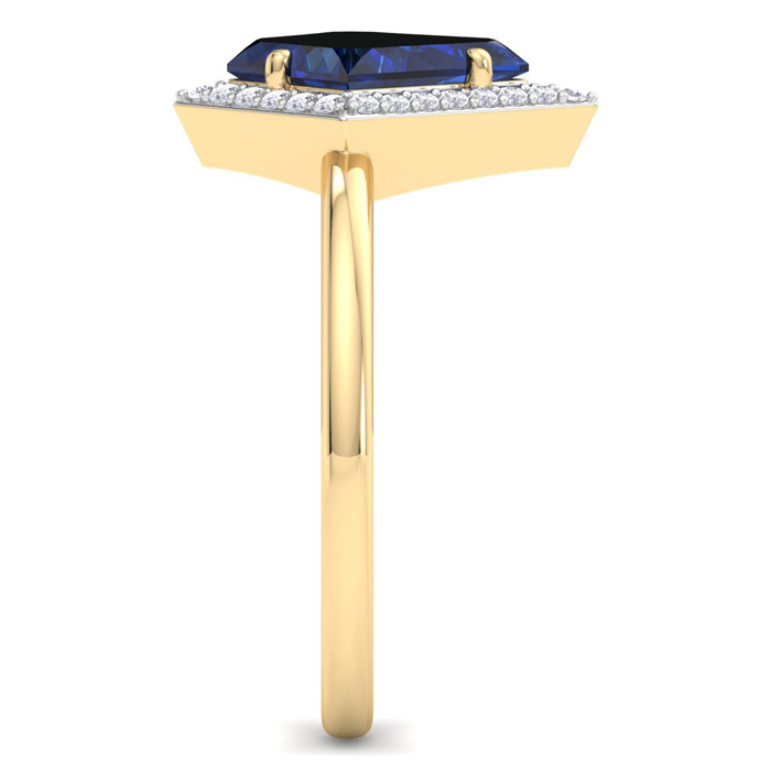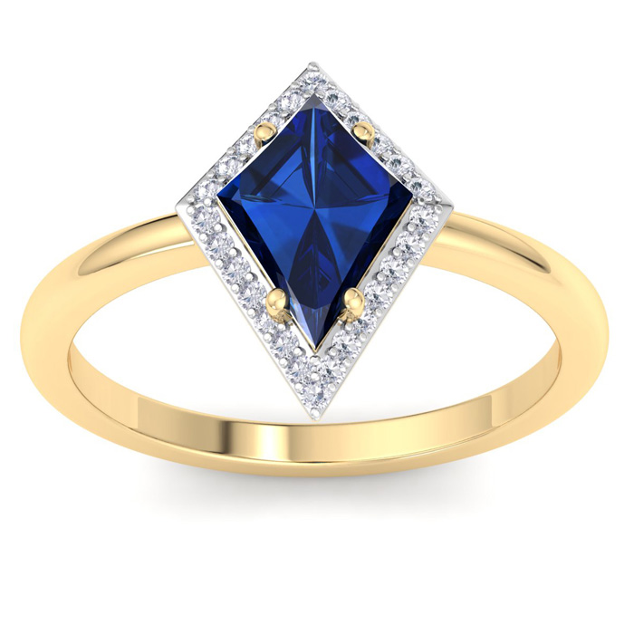 This gemstone ring features one 10x7mm kite shape created sapphire gemstone weighing approximately 1 1/2 carats. There are 26 sparkling diamonds in I-J color, I1-I2 clarity totaling approximately 1/4 carat. Total carat weight is 1 3/4 carats. This ring is in 14 karat yellow gold.