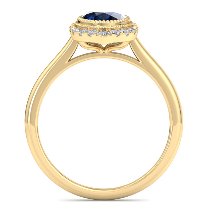 This gemstone ring features one 8x6mm oval shape sapphire gemstone weighing approximately 1 1/5 carats. There are 18 sparkling diamonds in I-J color, I1-I2 clarity totaling approximately 1/5 carat. Total carat weight is 1 3/4 carats. This ring is in 14 karat yellow gold.