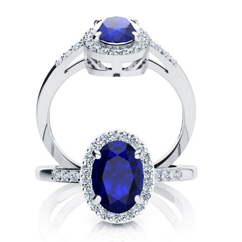 This sapphire ring features one 7x5mm oval shape created sapphire gemstone. It is surrounded by 24 sparkling diamonds totaling 1/8 carat in I-J color, I1-I2 clarity. Total carat weight is approximately 1.12 carats. This ring is in sterling silver.