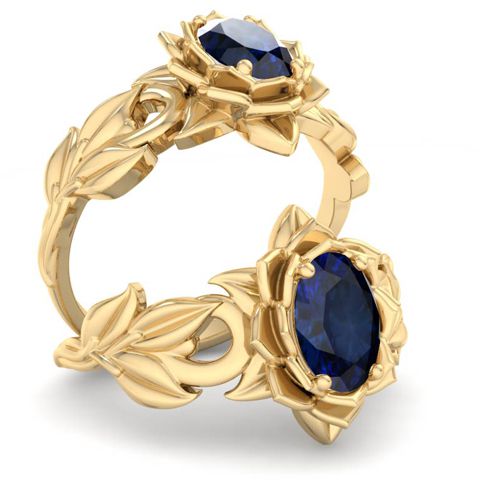 1 Carat Oval Shape Sapphire Ornate Ring In 14K Yellow Gold