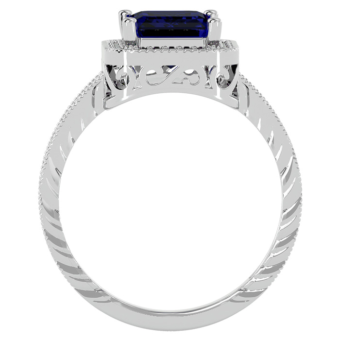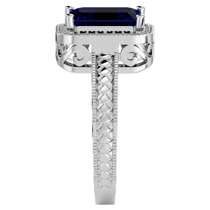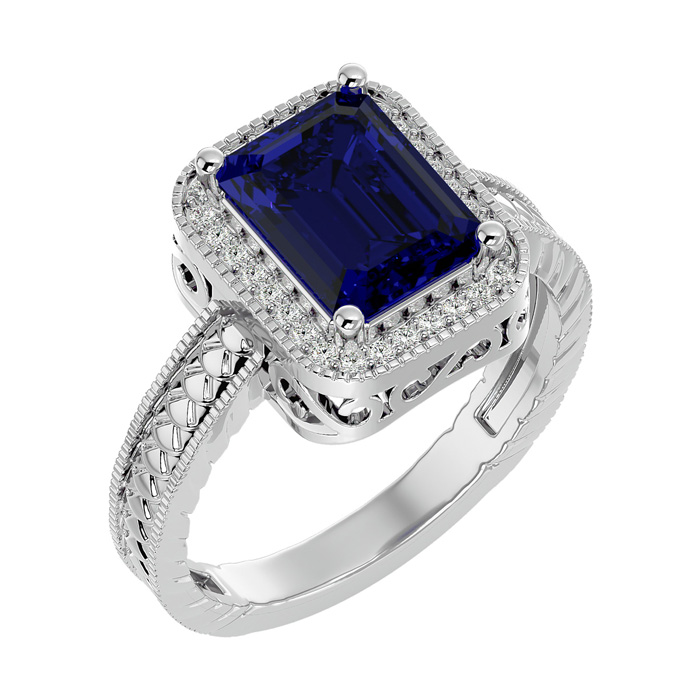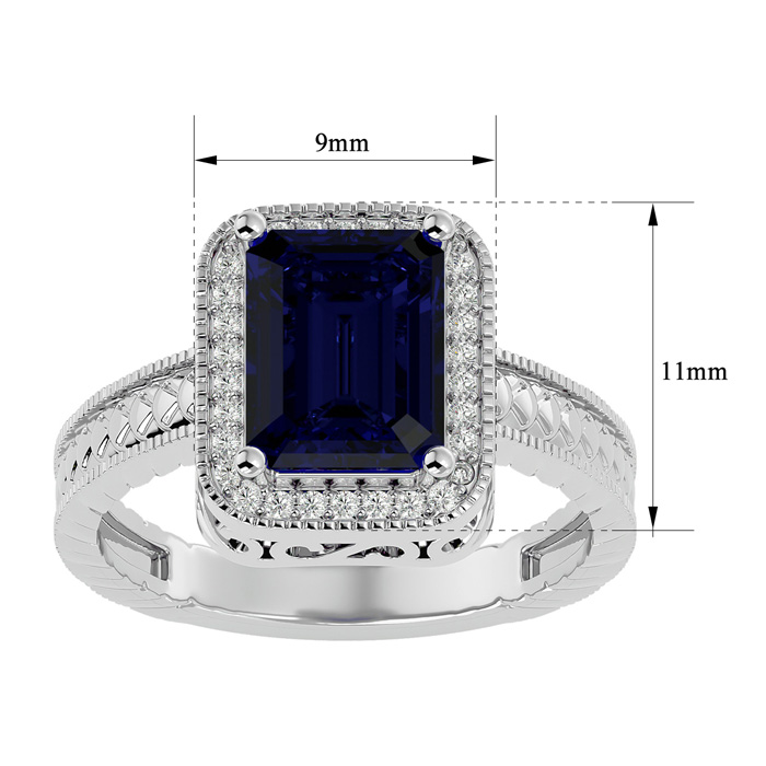 This sapphire ring features one 9x7mm emerald shape created sapphire gemstone. It is surrounded by 38 sparkling diamonds totaling 1/5 carat in I-J color, I1-I2 clarity. Total carat weight is approximately 2 3/4 carats. This ring is in sterling silver.