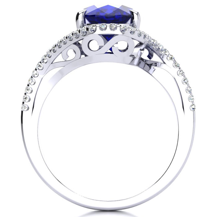 This sapphire ring features one 10x8mm oval shape created sapphire gemstone. It is surrounded by 50 sparkling diamonds totaling 1/4 carat in I-J color, I1-I2 clarity. Total carat weight is approximately 2 3/4 carats. This ring is in sterling silver.