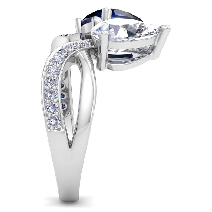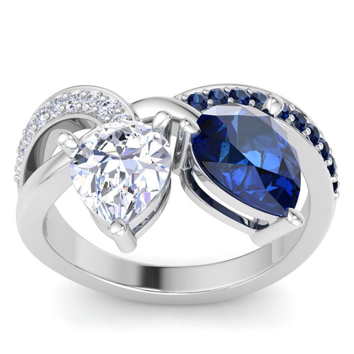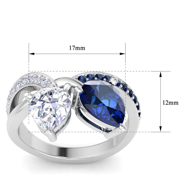 This sapphire ring features one 1 1/2 carat pear shape lab grown diamond in G-H color, VS clarity and one 1 3/4 carat pear shape sapphire gemstone. It is accented with 10 side sapphires and 9 side lab grown diamonds. Total carat weight is approximately 3 1/2 carats. This ring is in 14 karat white gold.
