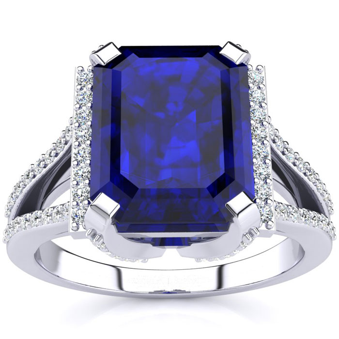 This sapphire ring features one 10x8mm emerald shape created sapphire gemstone. It is surrounded by 72 sparkling diamonds totaling 1/2 carat in I-J color, I1-I2 clarity. Total carat weight is approximately 4 carats. This ring is in sterling silver.