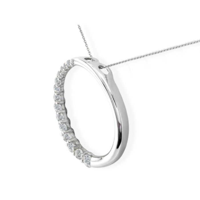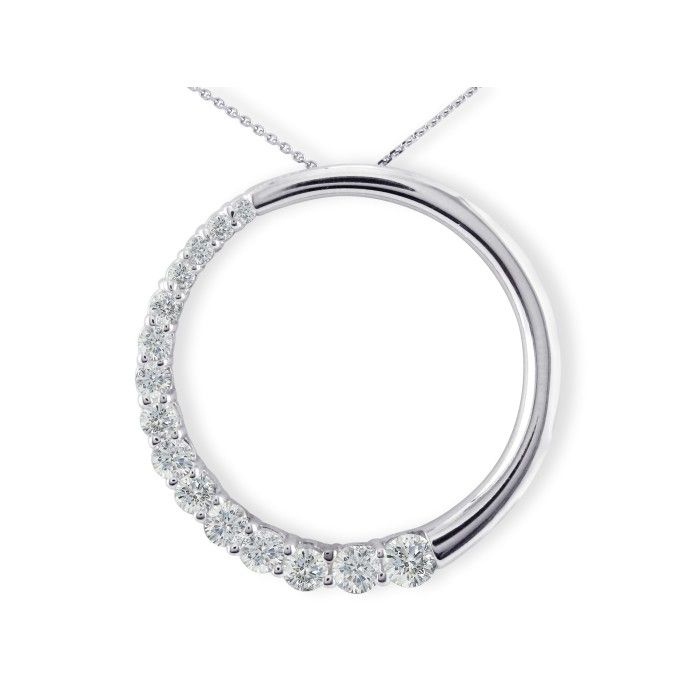 Show your loved one how your love has grown with this 3/4ct Diamond circle journey pendant handcrafted in 14k white gold. Fourteen shining diamonds grow down one side of the circle and has J/K color and I2 clarity. This pendant features an 18 inch chain with a spring ring clasp.