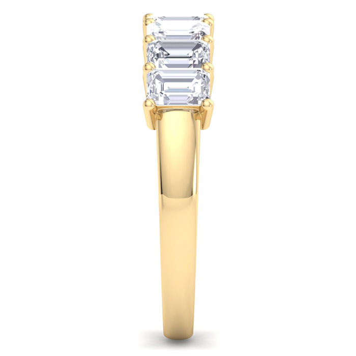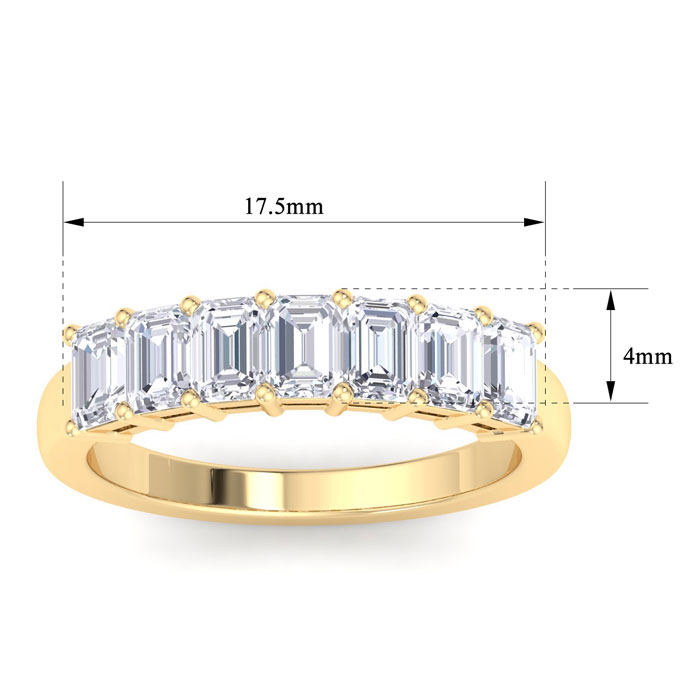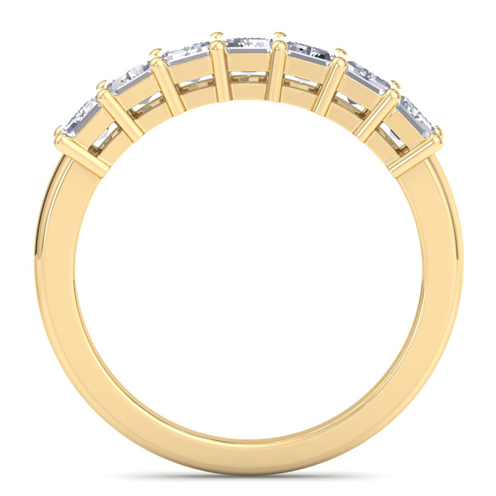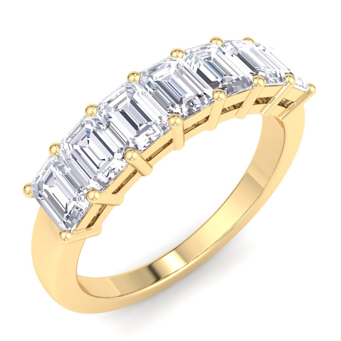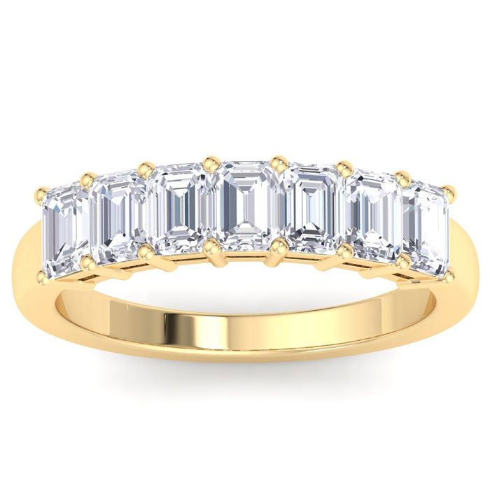 This amazing 7 diamond ring features 7 emerald cut diamonds each weighing approxiamtely 0.15 carats. Total diamond weight is 1 carat. Diamond color is G-H, diamond clarity is SI1. This ring is in 14 karat yellow gold.
