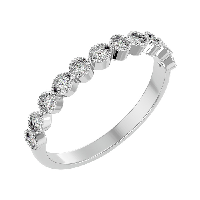 This fabulous moissanite thumb ring features 11 sparkling moissanites in E-F color, VVS1-VVS2 clarity totaling approximately 1/10 carat. This ring is in 14 karat white gold.