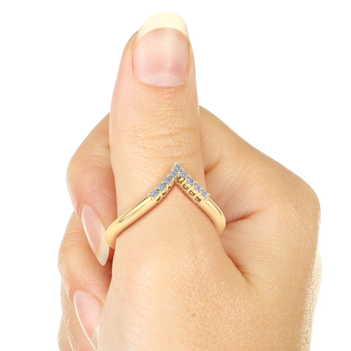 This thumb ring features 9 moissanites in E-F color, VVS1-VVS2 clarity. Total carat weight is approximately 1/10 carat. This ring is in 14 karat yellow gold.