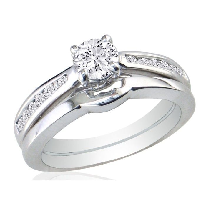 Lover of the traditional? This is the most conservative diamond channel set bridal set. 14 karat white gold, diamond bridal set. Diamond content is 3/4 ct in H-I color, SI2-I1 clarity. The center diamond is so gorgeous and fier.